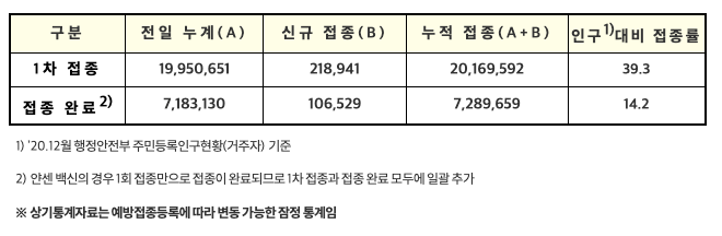 또한, 예방접종은 1차 접종이 약 2천만 명, 접종 완료가 약 730만 명으로, 우리나라 총 인구 대비 14.2%가 접종을 완료했습니다.