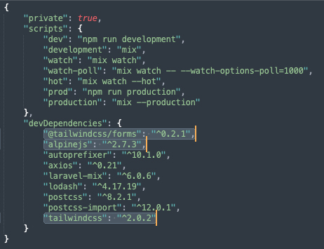 - package.json 파일을 살펴보면, tailwindcss와 alpinejs가 적용된 것을 확인할 수 있다.